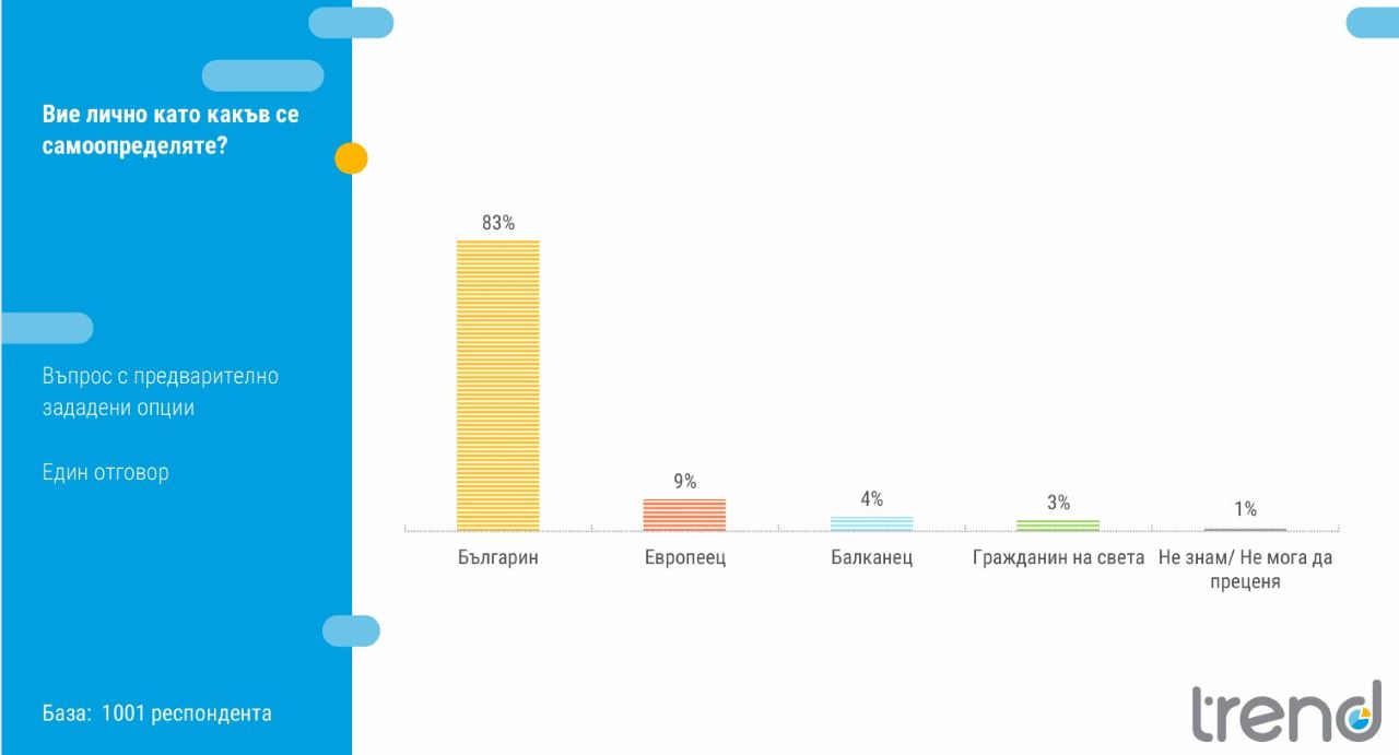 На въпроса „Вие лично като какъв се самоопределяте“ 83% от интервюираните отговарят „българин“, докато значително по-малко се определят като „европеец“ - 9%, „балканец“ - 4%, или „гражданин на света“ - 3%. Данните очертават ясно доминиране на националната идентичност като основна принадлежност, казват от социологическата агенция.