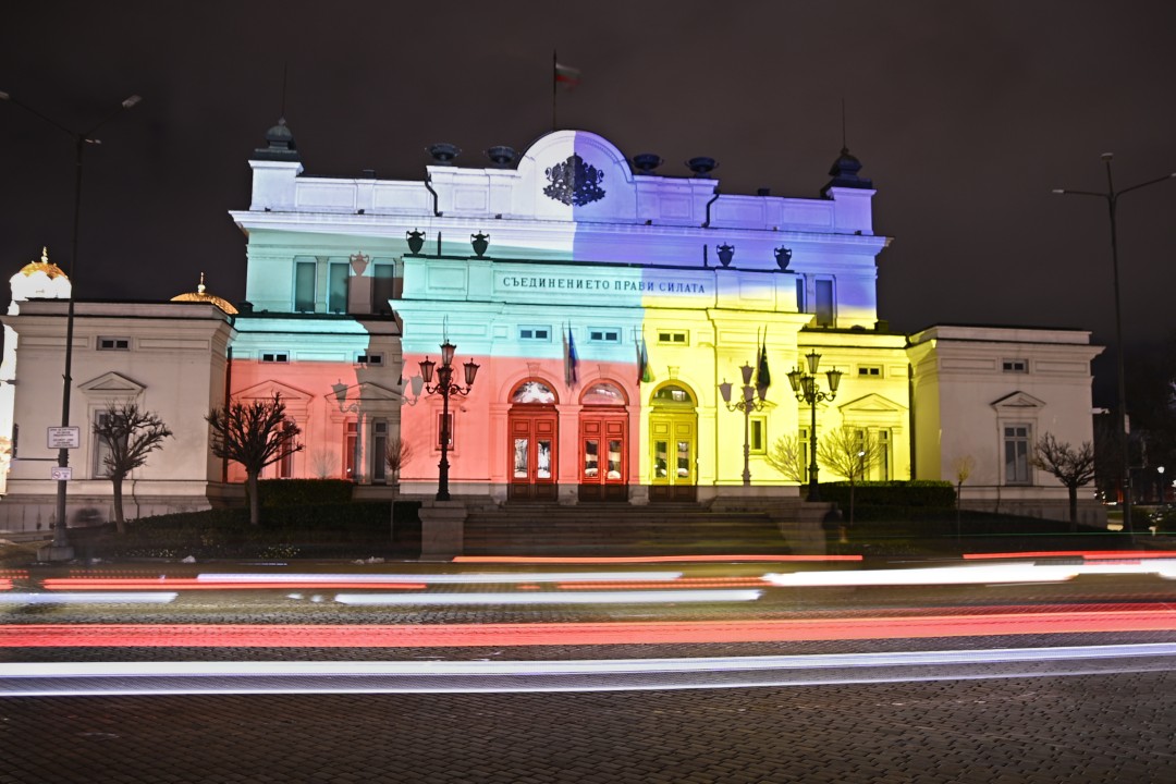 И сторическата сграда на българския парламент беше осветена с цветовете на българския и украинския флаг по повод четвъртата годишнина от началото на пълномащабната военна агресия на Русия срещу Украйна.