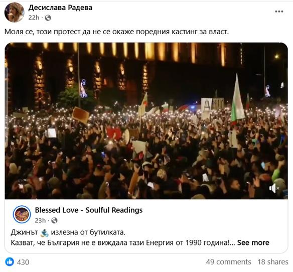 "Казват, че България не е виждала тази енергия от 1990 година!", пише още под видео от протестното шествие в София.