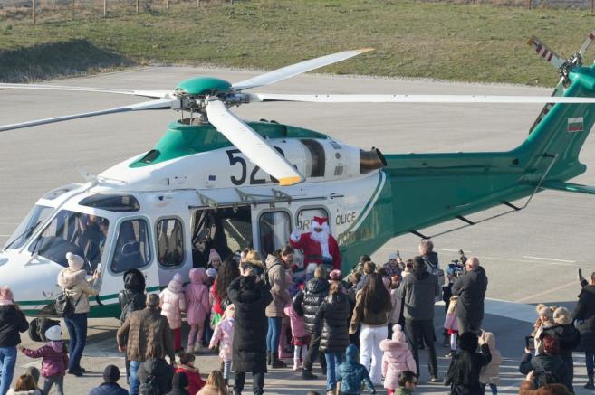 След това настъпи моментът, в който Дядо Коледа и Снежанка пристигнаха с гранично-полицейския хеликоптер. По традиция до елхата в авиобазата на ГД „Гранична полиция“ около 100 малчугани на възраст от 2 до 11 години получиха своите подаръци.