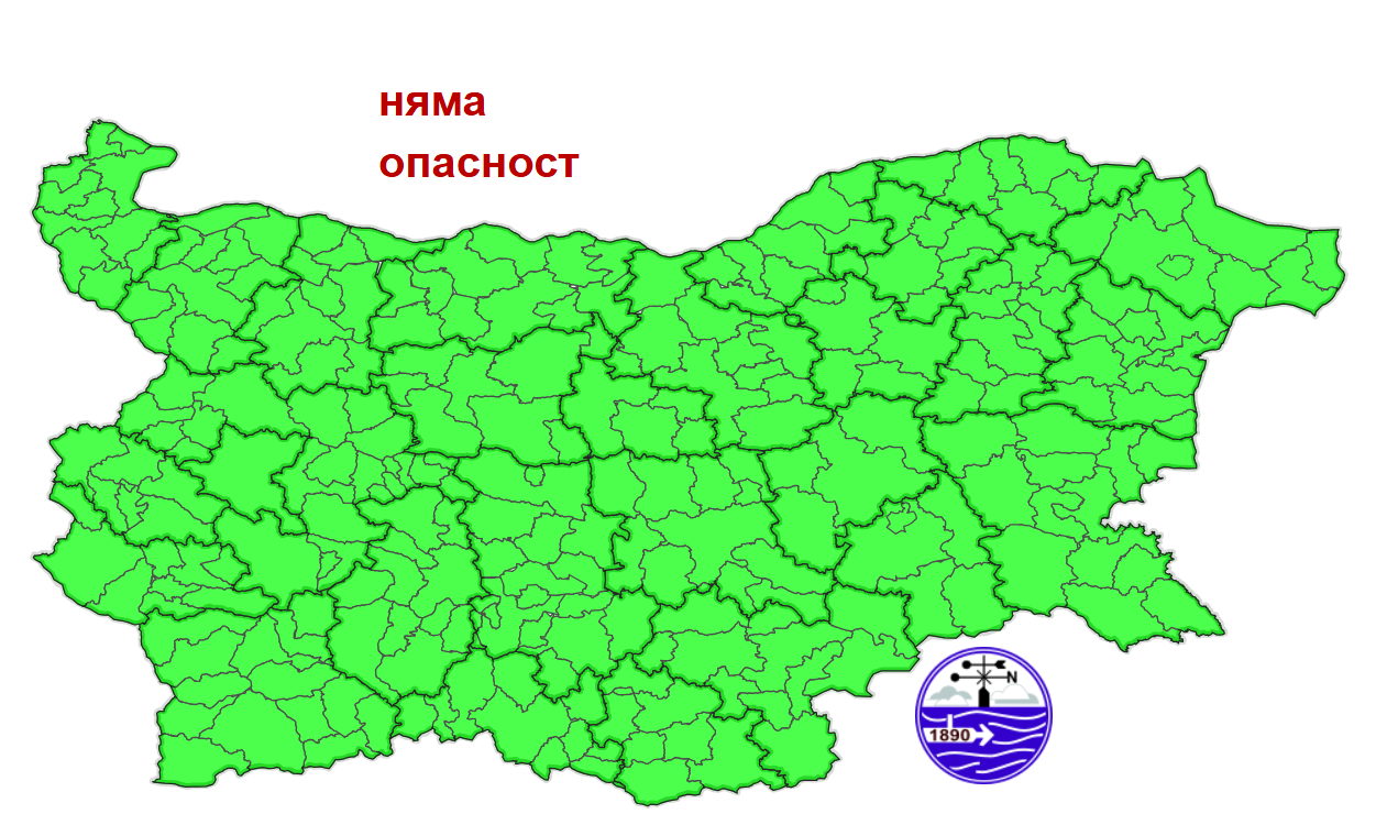 Няма обявени предупредителни кодове за опасни явления. Картата на НИМХ е оцветена в зелено.