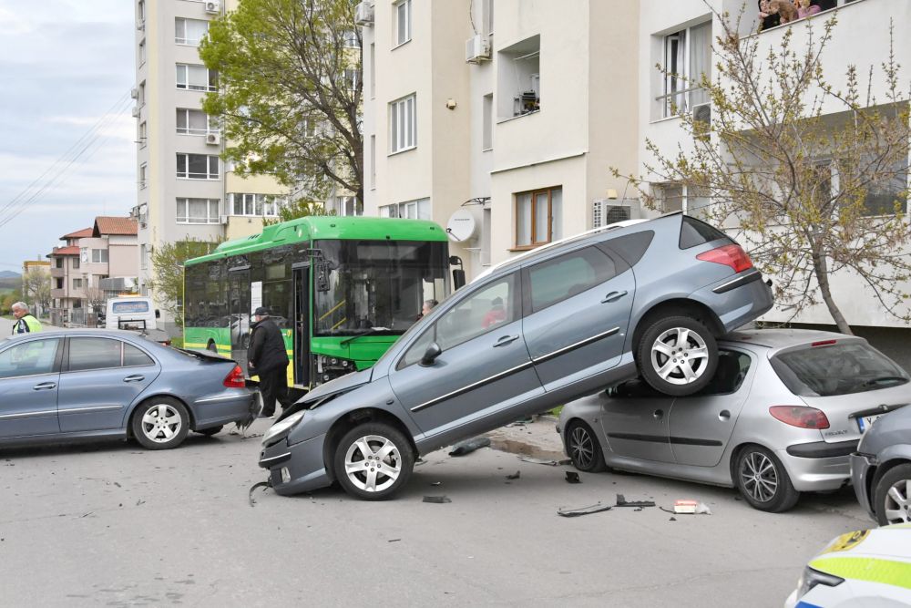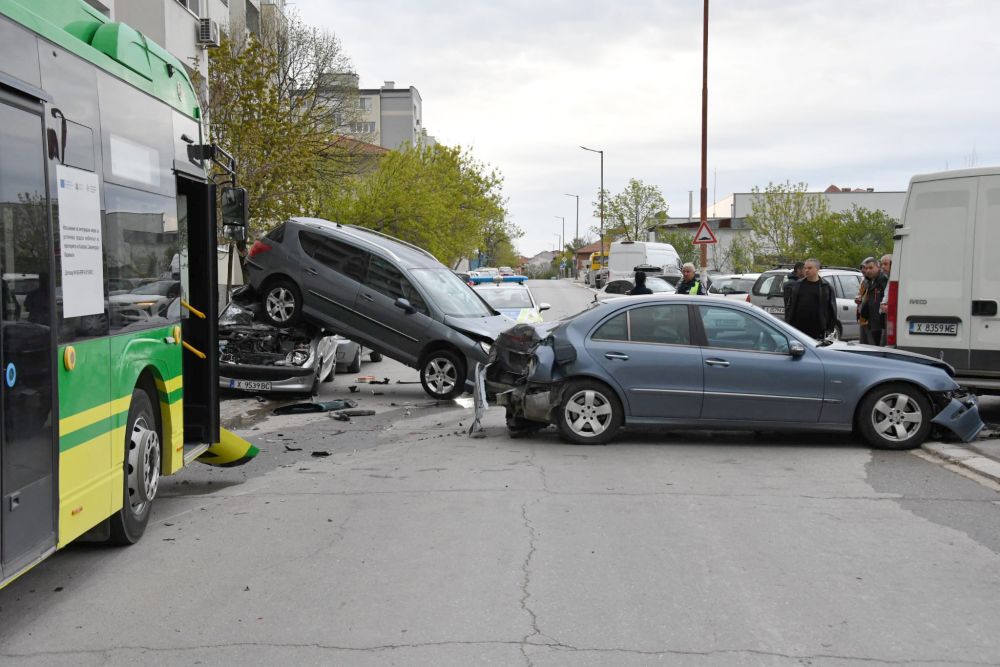 Автомобилите са се преобърнали един върху друг. При инцидента няма пострадали, а пробите на шофьора за алкохол и наркотици са отрицателни.
