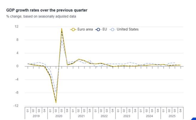 В сравнение със същото тримесечие на предходната година, БВП е нараснал с 1,3 на сто в еврозоната и с 1,5 на сто в ЕС през четвъртото тримесечие на 2025 г. През предходното тримесечие годишният ръст бе 1,4 на сто в еврозоната и 1,6 на сто в ЕС.