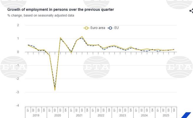 Като цяло през 2025 г. заетостта се е увеличила с 0,7 на сто в еврозоната и с 0,5 на сто в ЕС.