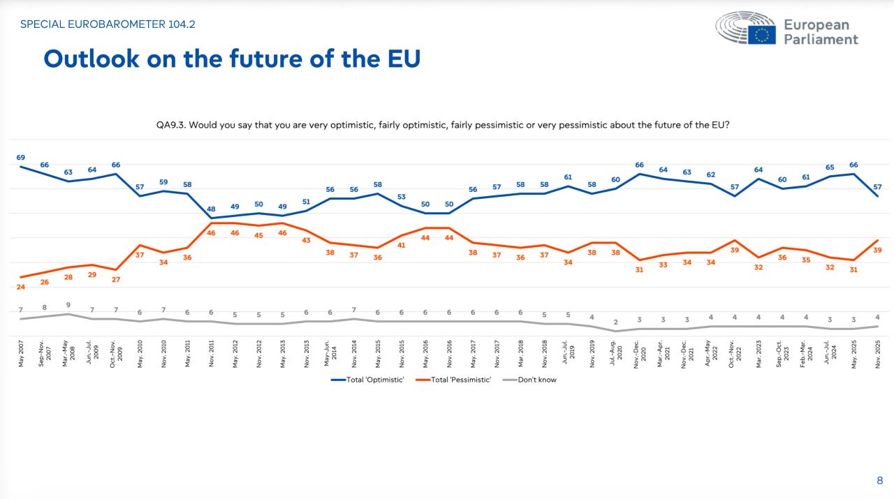 П овечето българи и граждани на ЕС са настроени оптимистично за бъдещето, показват данните от проучване на "Евробарометър", представено днес от Европейския парламент.