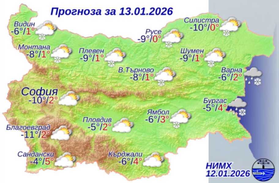И във вторник времето в страната ще остане студено, минималните температури ще са още по-ниски, а дневните слабо ще се повишат. Облачността отново ще се увеличи и на места в Северна България, и в Средногорието ще превали слаб сняг. Вятърът ще е до умерен, от запад-югозапад, се съобщава в седмичната прогноза за времето у нас от 13 до 18 януари, подготвена от дежурния синоптик Марияна Попова от отдела "Прогнози на времето" в Националния институт по метеорология и хидрология (НИМХ).