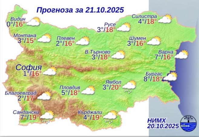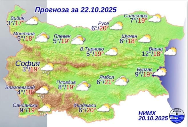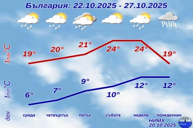 В петък вятърът временно ще се ориентира от северозапад и ще се усили. Облачността ще се увеличи и на места от запад на изток ще превали дъжд. През почивните дни ще се усили вятърът от юг-югозапад, особено в Източна България и северно от планините. Ще е топло за края на октомври с максимални температури предимно между 22° и 27°.