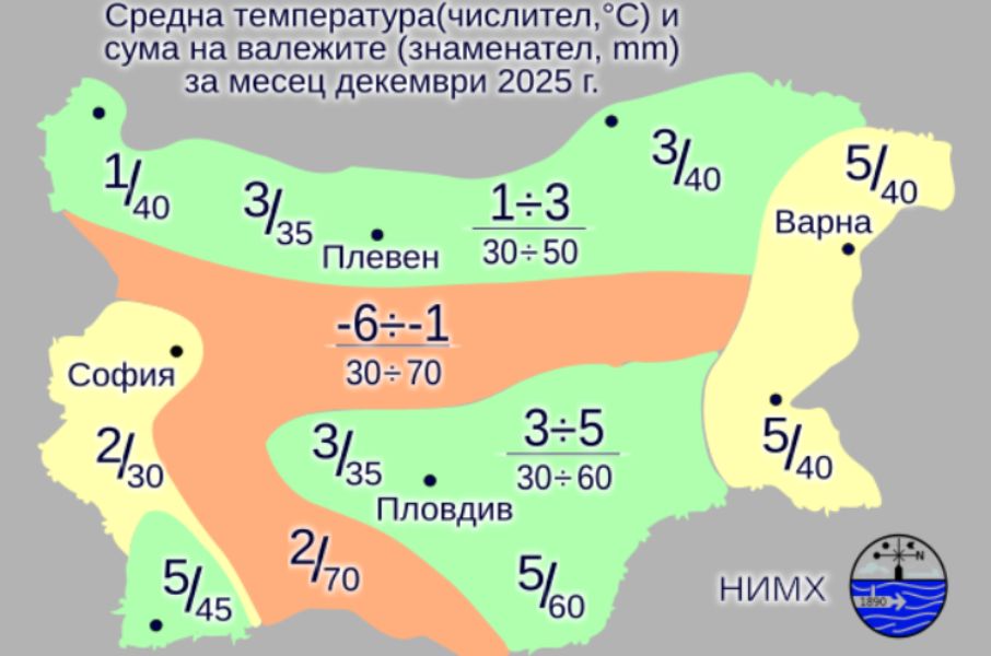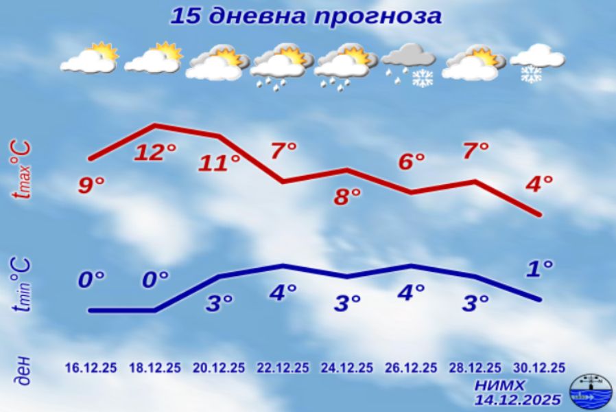 Според 15-дневната прогнозата на НИМХ до края на този месец облачността ще е по-често значителна, ще има и превалявания, предимно слаби и предимно от дъжд, като в ниските планински райони към 26-27 декември може да премине и в сняг. Температурите ще се доближат до климатичните норми. През последните дни от месеца времето у нас ще се задържи предимно облачно, остава с повишена вероятност за валежи, предимно от сняг, в югоизточните райони и по Черноморието - от дъжд.