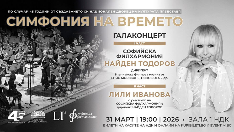 Кулминацията на вечерта е галаконцертът „Симфония на времето“ от 19:00 ч. в Зала 1. Преди началото на концерта ще има тържествено откриване с приветствия от президента г-жа Илияна Йотова, министъра на културата г-н Найден Тодоров и изпълнителния директор на НДК г-жа Андрияна Петкова. Официалната церемония може да бъде заснемана, както и началото на концерта, който ще започне с изпълнение на Софийската филхармония с диригент маестро Найден Тодоров. Втората част, с участието на Лили Иванова, не може да бъде заснемана.