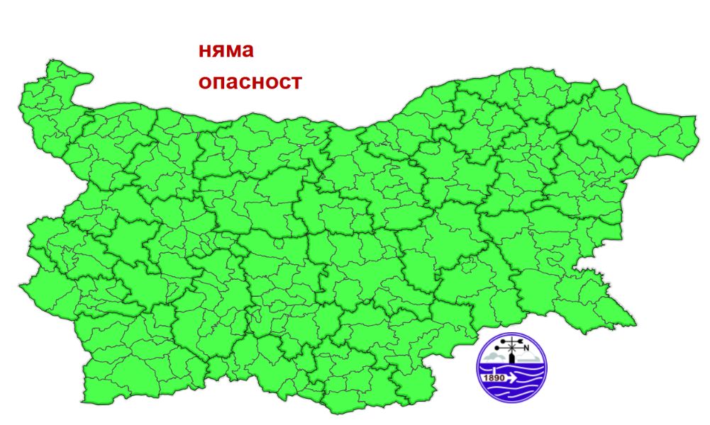 Няма обявени предупредителни кодове за опасни явления. Картата на НИМХ е оцветена в зелено.