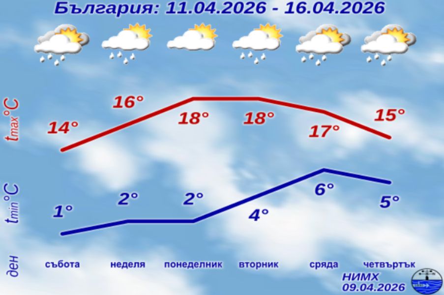 На Велика събота над по-голямата част от страната облачността ще се задържи значителна и все още на отделни места, главно в югозападните и планинските райони, ще има краткотрайни валежи от дъжд, а в планините над 1500 метра – от сняг. Вятърът ще отслабне и ще се ориентира от югоизток. Ще се задържи хладно с минимални температури между минус 1° и 4°, а максималните – между 12° и 17°.