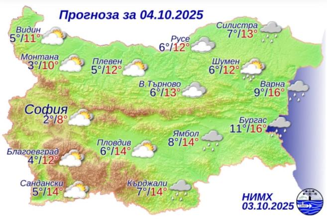 Днес дъждовно ще се задържи времето в източните и планинските райони. Вятърът в цялата страна ще се ориентира от запад-северозапад, ще е слаб до умерен. Минималните температури ще бъдат между 2° и 7°, а максималните – предимно между 8° и 13°, по-високи в югоизточните райони и по Черноморието.