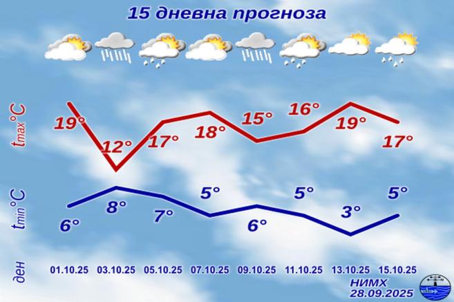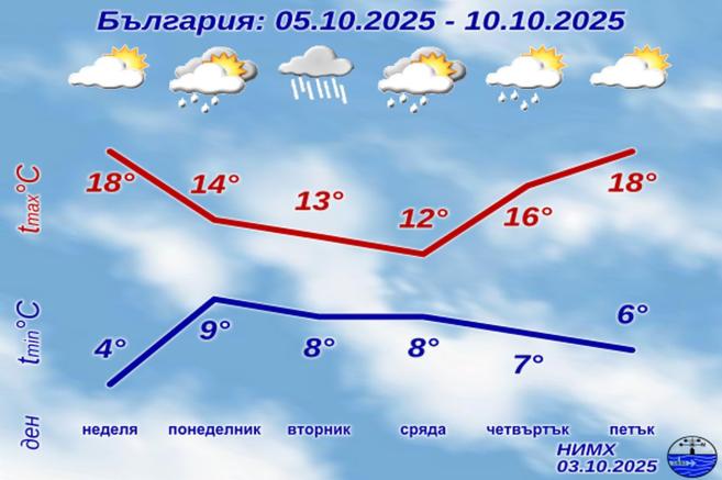 В неделя над цялата страна облачността временно ще намалее до предимно слънчево. Сутринта в котловините ще е почти тихо или със слаб югозападен вятър и в отделни райони в равнинната част от страната видимостта ще е намалена, а в котловините ще има условия за слана. Минималните температури ще бъдат между 0° и 5°, по Черноморието 8°-10°, а дневните с до умерен запад-югозападен вятър ще се повишат до 16°-21°. Привечер с ново увеличение на облачността в северозападните райони ще превали.