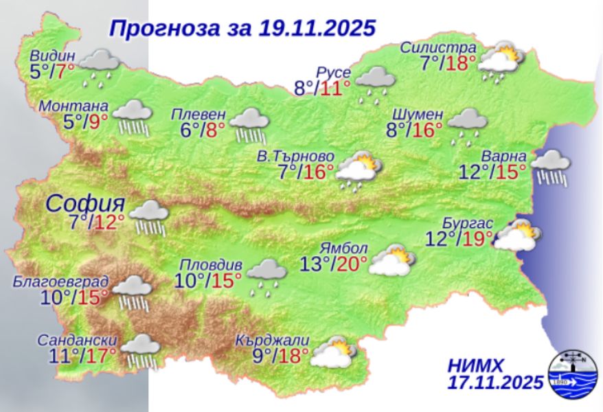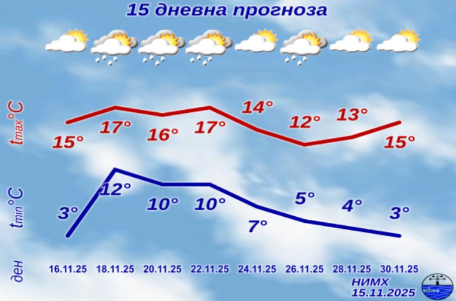 Повишена вероятност за валежи се очаква около 22–23 ноември, последвани от захлаждане.