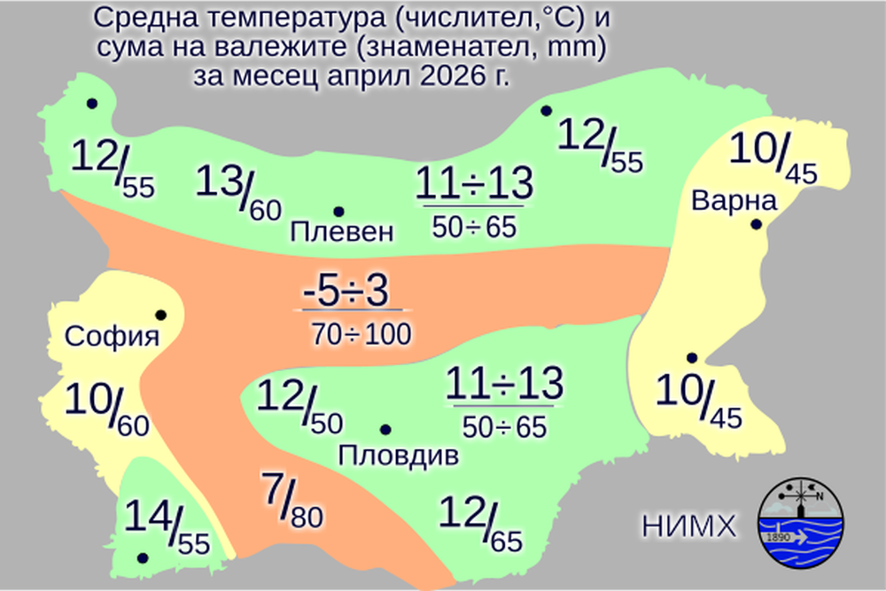 По думите му тази година през април се очаква средната месечна температура да бъде около и под нормата, която за по-голямата част от страната е между 10 и 13 градуса, по Черноморието и във високите полета - между 8 и 14 градуса, а за планините - от минус 5 до 3 градуса.