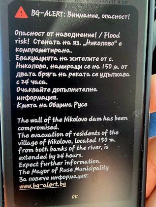 Е вакуацията на жители от Николово заради свлачището на язовирната дига до русенското село се удължава с 24 часа. Това заяви за БТА кметът на Община Русе Пенчо Милков. За целта отново беше изпратено съобщение чрез системата BG-Alert.
