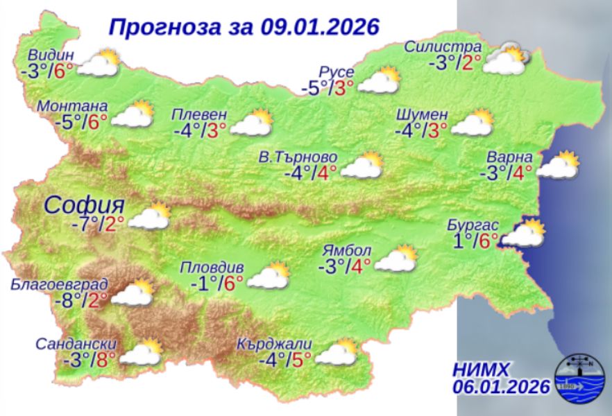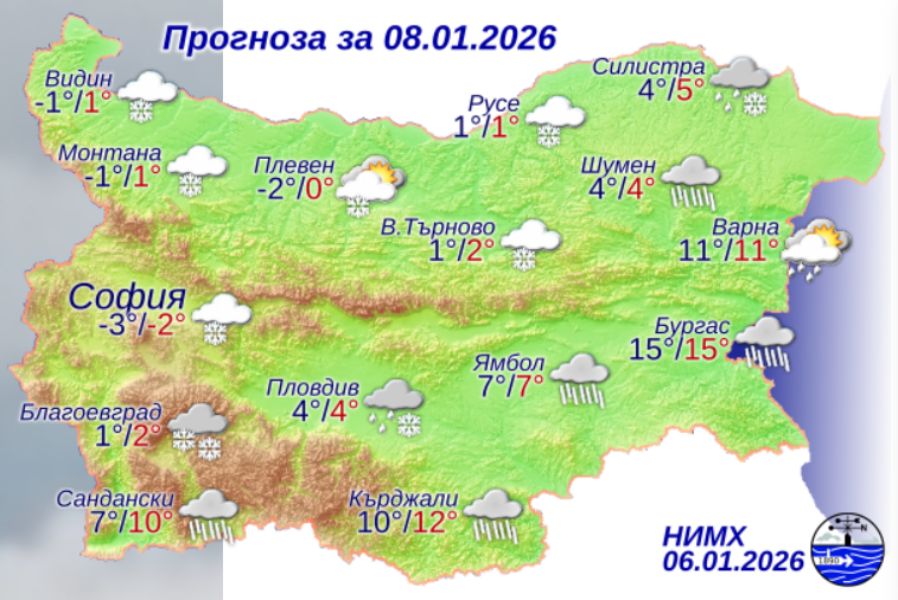 През нощта срещу петък валежите бързо ще спрат, а облачността ще се разкъса, в петък и ще намалее до предимно слънчево. Вятърът ще отслабне и ще се ориентира от юг. Минималните температури ще бъдат между минус 8° и минус 3°, а максималните - между 2° и 7°.