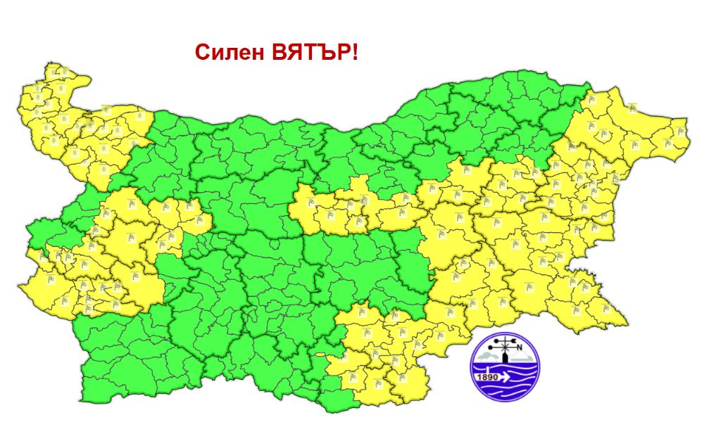 Жълт код за потенциално опасно време е обявен за областите: Видин, Враца, Монтана, Благоевград, Смолян, Габрово, Сливен, Разград, Търговище, Силистра, Добрич, Варна, Бургас, Шумен, Ямбол, Хасково.