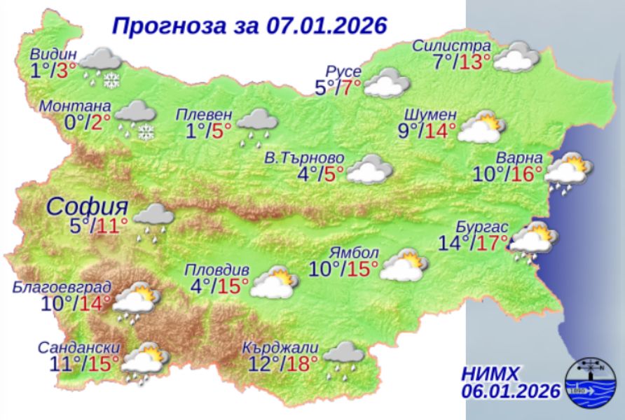 В сряда ще бъде предимно облачно и ветровито. На много места в Западна и Централна България ще има валежи от дъжд, значителни в крайните южни райони от страната. Ще духа умерен до силен вятър от юг-югозапад и с него температурите ще останат високи. В Дунавската равнина вятърът ще се ориентира от запад-северозапад и ще започне да нахлува студен въздух. Валежите ще продължат и през нощта срещу четвъртък и с понижението на температурите в Северозападна България ще има условия за образуване на поледици.