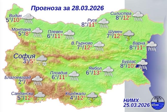 В петък облачността ще се увеличи и от запад на изток на много места ще има валежи от дъжд, в планините над 1300-1400 метра – от сняг. В отделни райони ще са временно интензивни и значителни по количество, с гръмотевици. Вятърът ще е слаб, все още от югоизток. Минималните температури ще бъдат между 3° и 8°, а максималните – между 10° и 15°.