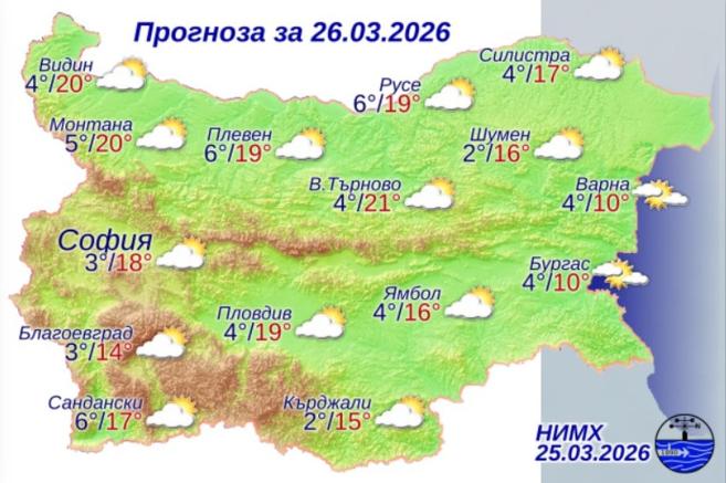 Утре ще преобладава слънчево време с разкъсана висока облачност, в западните райони около и след пладне и с незначителна купеста. Вятърът ще е до умерен, в местата, разположени около северните склонове на планините и по долината на Струма, и силен вятър от юг-югоизток. Максималните температури ще бъдат между 13° и 18°, в местата чувствителни на южен вятър с 2-3° по-високи; в София – около 18°.