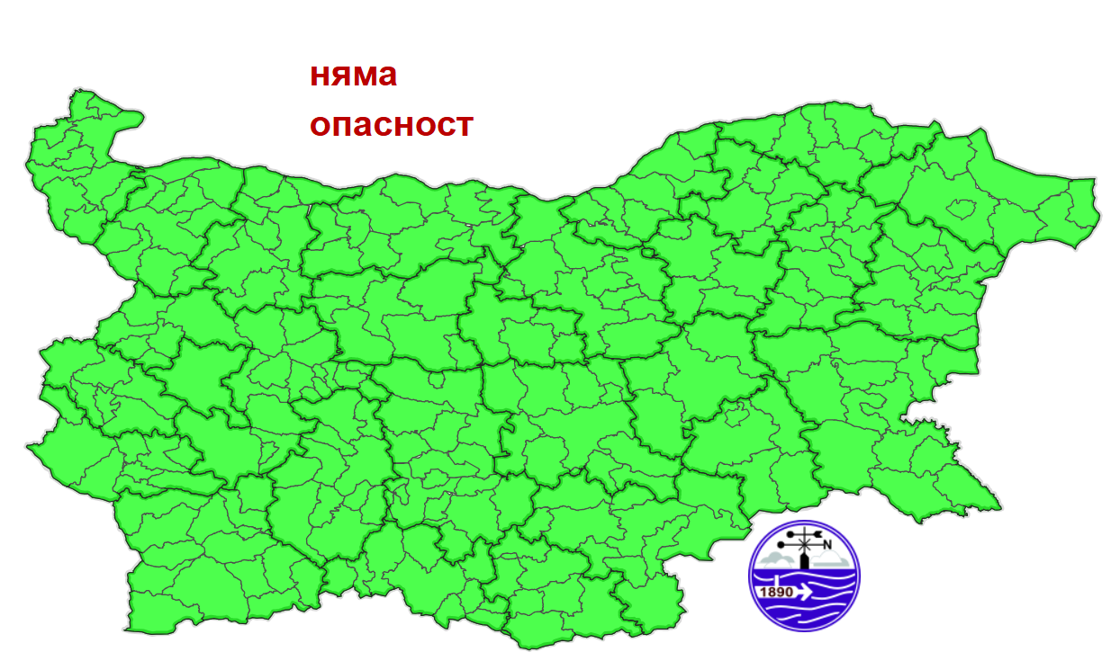 Няма обявени предупредителни кодове за опасни явления. Картата на НИМХ е оцветена в зелено.
