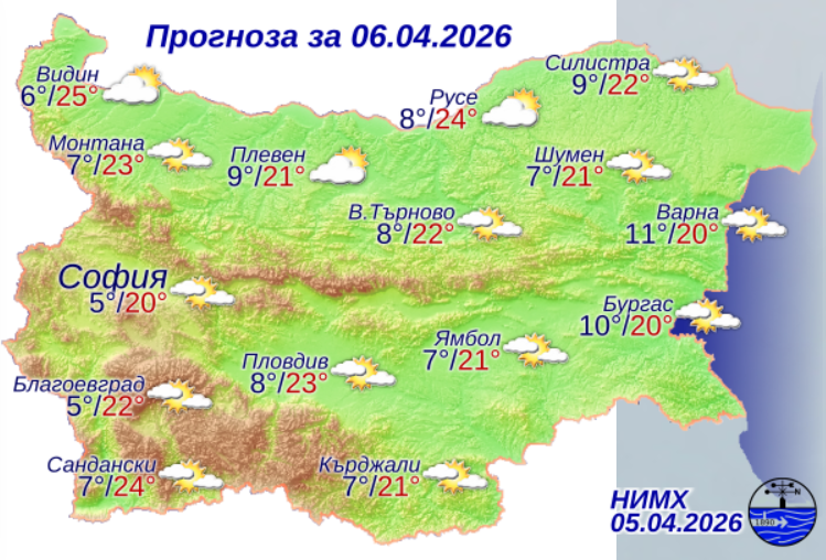 По Черноморието ще бъде предимно слънчево, в следобедните часове с временни увеличения на облачността. Ще духа слаб вятър от запад-северозапад, който след обяд ще се ориентира от юг-югозапад и ще се усили до умерен. Максималните температури ще бъдат между 16° и 20°. Температурата на морската вода е 9°-11°. Вълнението на морето ще бъде 1-2 бала.