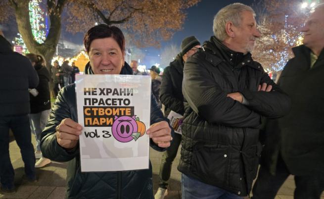 Г раждани протестираха срещу управляващите в центъра на София. Демонстрацията, която е заявена в Столична община, е организирана от "Продължаваме Промяната - Демократична България" и е под надслов „Не храни прасето с твоите пари Vol. 3“.