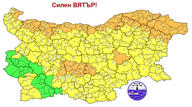 Оранжев код е издаден за 15 области – Видин, Монтана, Враца, Плевен, Велико Търново, Русе, Разград, Силистра, Добрич, Шумен, Варна, Сливен, Стара Загора, Пловдив и Пазарджик.