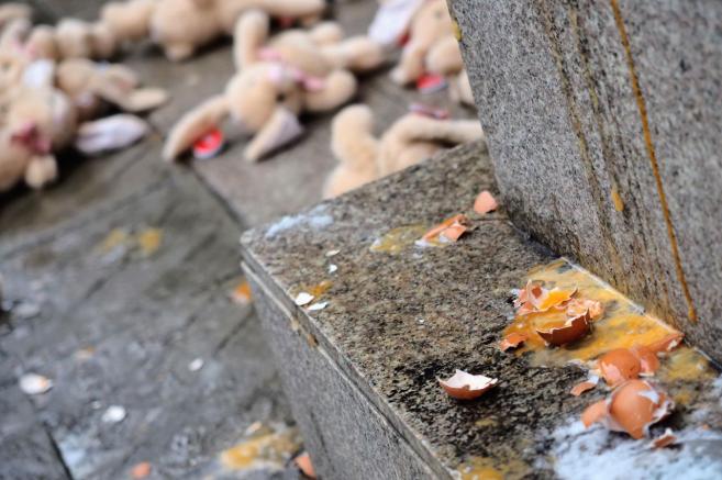 Протестиращите разхвърляха плюшени розови зайчета на улицата пред Висшия съдебен съвет, символ на "послушанието" в съдебната система.