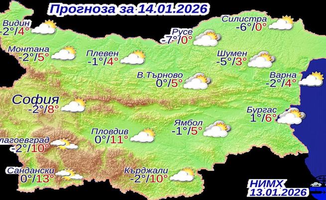 П рез нощта облачността ще е значителна, на места в източните райони и планините ще превали слаб сняг. Ще духа слаб вятър от запад-северозапад. Сутринта, главно около Дунав ще е тихо и там ще е с намалена видимост и мъгла. Минималните температури ще са предимно между -6 градуса и -1 градус, по-ниски в местата със снежна покривка, а в София – около -2 градуса.