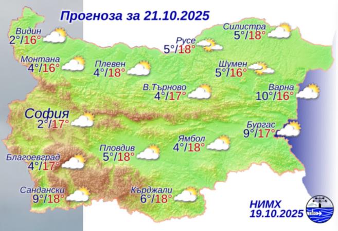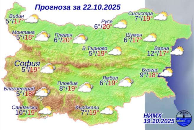 Във вторник ще бъде предимно слънчево с разкъсана висока облачност. Вятърът ще е слаб от югоизток. Минималните температури в по-голямата част от страната ще бъдат между 3° и 8°, все още в отделни котловини и по-ниски и там остават условията за образуване на слана. Максималните ще са между 15° и 20°.