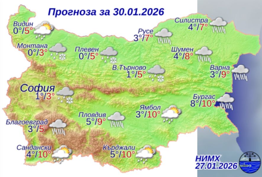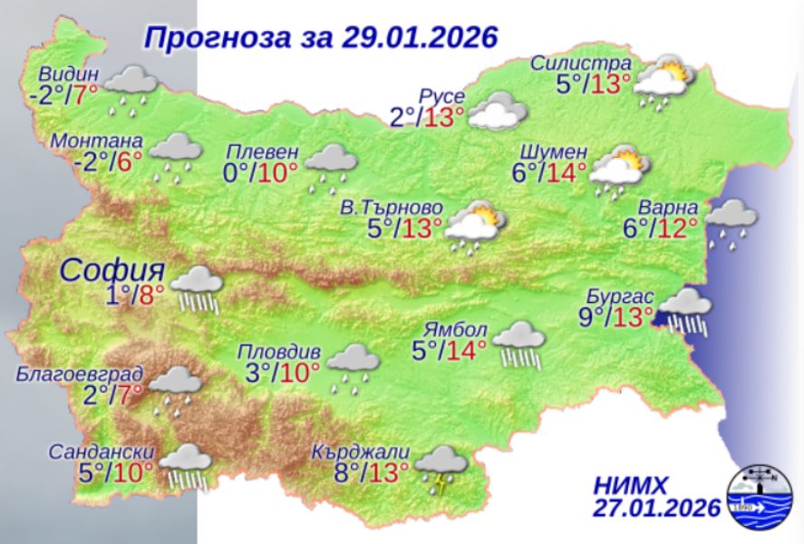 Минималните температури ще бъдат между 0° и 5°, в югоизточните райони до 7°- 8°, а максималните – между 7° и 12°, по-високи в Източна България; а в петък температурите ще се понижат.