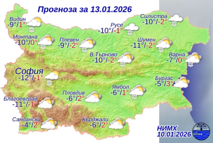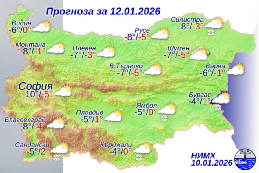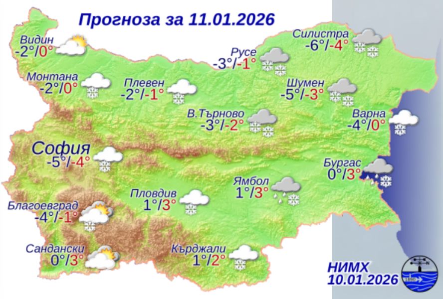 Минималните температури ще са между минус 6° и минус 1°, а максималните ще са между минус 5° и 0°, по-високи в югоизточните райони.