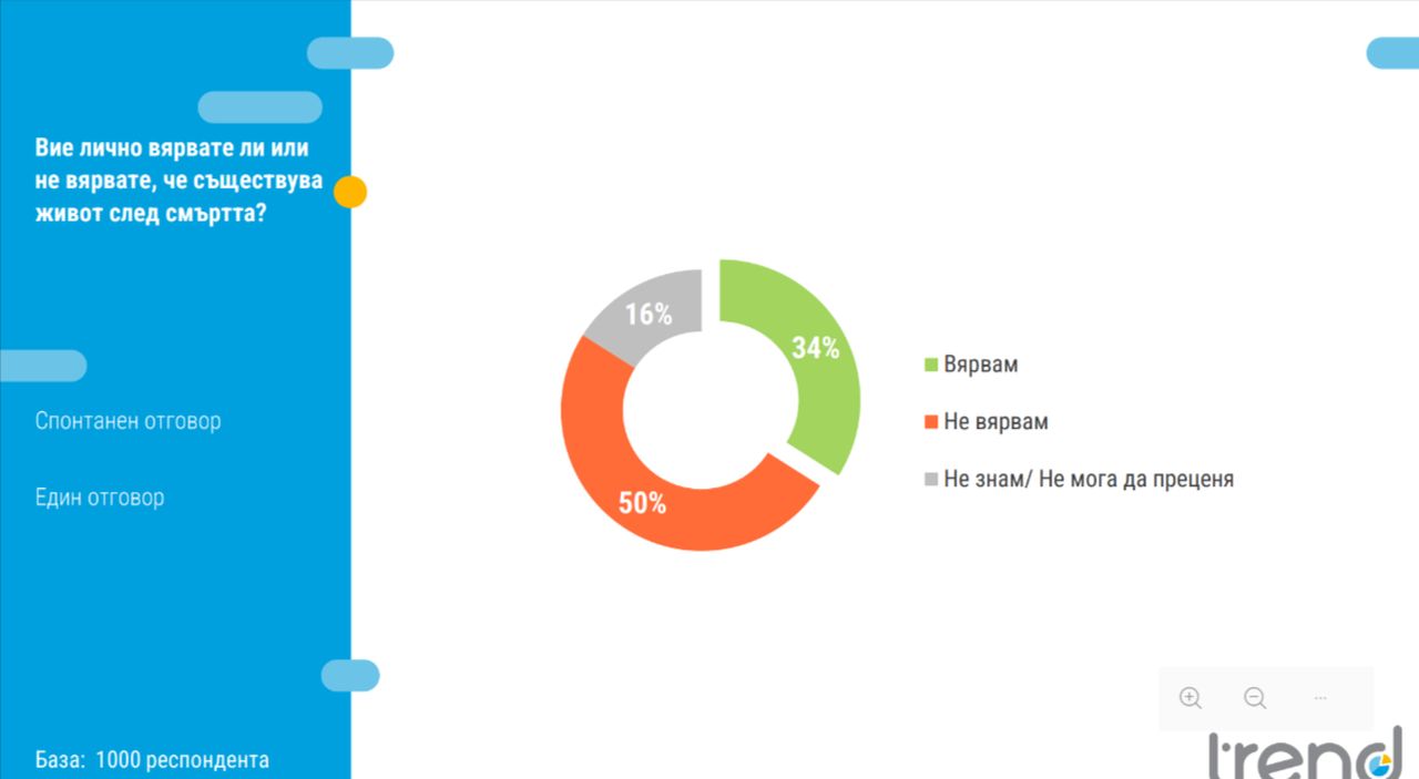 34% от българите вярват, че съществува живот след смъртта, докато половината (50%) не споделят това убеждение. Жените са значително по-склонни да вярват в задгробния живот за сметка на мъжете. Прави впечатление, че с увеличаването на възрастта се увеличава делът на съгласните, че съществува живот след смъртта, пише NOVA.