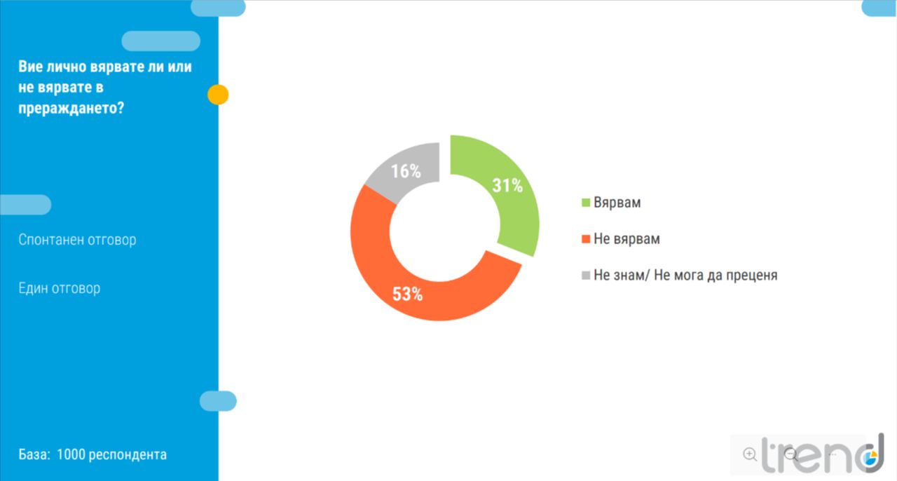 31% вярват, че човек се преражда, докато 53% посочват, че не вярват.