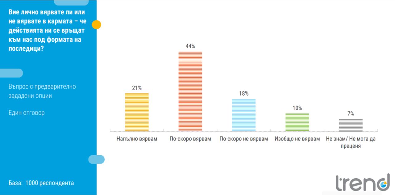 Най-широко разпространено сред българите е убеждението, че „всичко се връща“ – 65% от анкетираните вярват в кармата, или приблизително над 3,5 милиона души. Жените са по-склонни да вярват в кармата за сметка на мъжете. Едва 10% посочват, че изобщо не вярват.