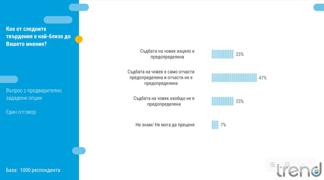 Почти половината българи (47%) смятат, че съдбата е отчасти предопределена и отчасти резултат от личен избор, което разкрива нюансирано разбиране между вярата и личната отговорност. Равни дялове от по 23% споделят двете крайни мнения – че съдбата е или напълно предопределена, или изцяло в ръцете на човека.