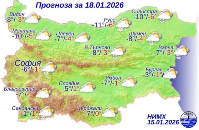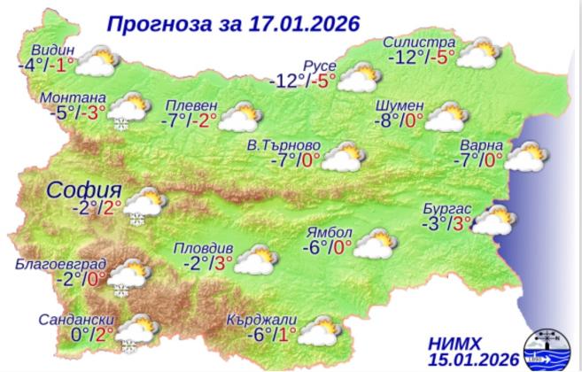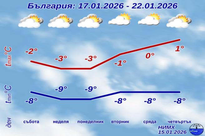 В събота и неделя ще има значителна облачност, в източните и планинските райони не са изключени изолирани слаби валежи от сняг. В понеделник ще има по-значителни разкъсвания и намаления на облачността, на много места временно и до предимно слънчево. Вероятността за валежи е малка. Температурите ще се понижат още, в неделя и понеделник минималните ще са между минус 12° и минус 7°, а максималните - от минус 5° - минус 6° в северните до 2°-3° в крайните южни райони.