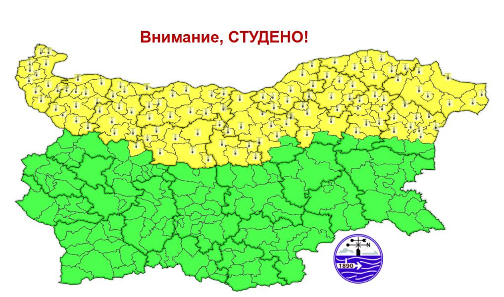 Предупреждението за студено време и отрицателни температури е в сила за областите Варна, Велико Търново, Видин, Враца, Габрово, Добрич, Ловеч, Монтана, Плевен, Разград, Русе, Силистра, Търговище и Шумен. За област Добрич предупреждението е и за силен северен вятър в крайните източни райони.