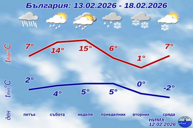 На 15 февруари в неделя времето ще е много динамично. Ще има валежи от дъжд, по линията на преминаващия студен фронт, придружени с гръмотевици. Възможни са локални интензивни валежи с временно усилване на вятъра. Максималните температури ще са все още високи, особено в районите с южен вятър - до 18-20 градуса, но от северозапад ще започнат да се понижават.