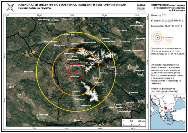 З еметресение с магнитуд 2.7 по Рихтер е регистрирано в района на град Благоевград. Това съобщават от НИГГГ-БАН.