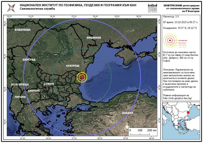 З еметресение с магнитуд 3.5 по скалата на Рихтер край Варна.