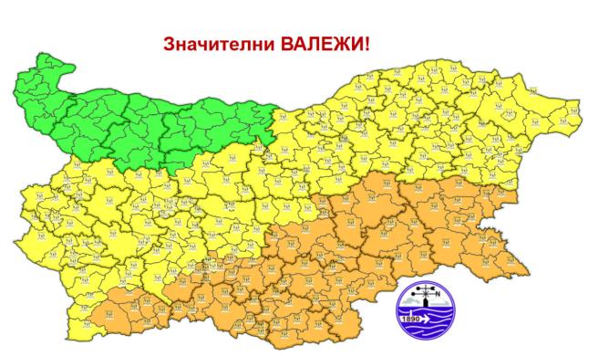 Оранжев код за опасно време е обявен за областите: Бургас, Ямбол, Сливен, Хасково, Ст. Загора, Кърджали, Пловдив, Смолян, Благоевград, Ловеч, София Област, София, Перник, Кюстендил.