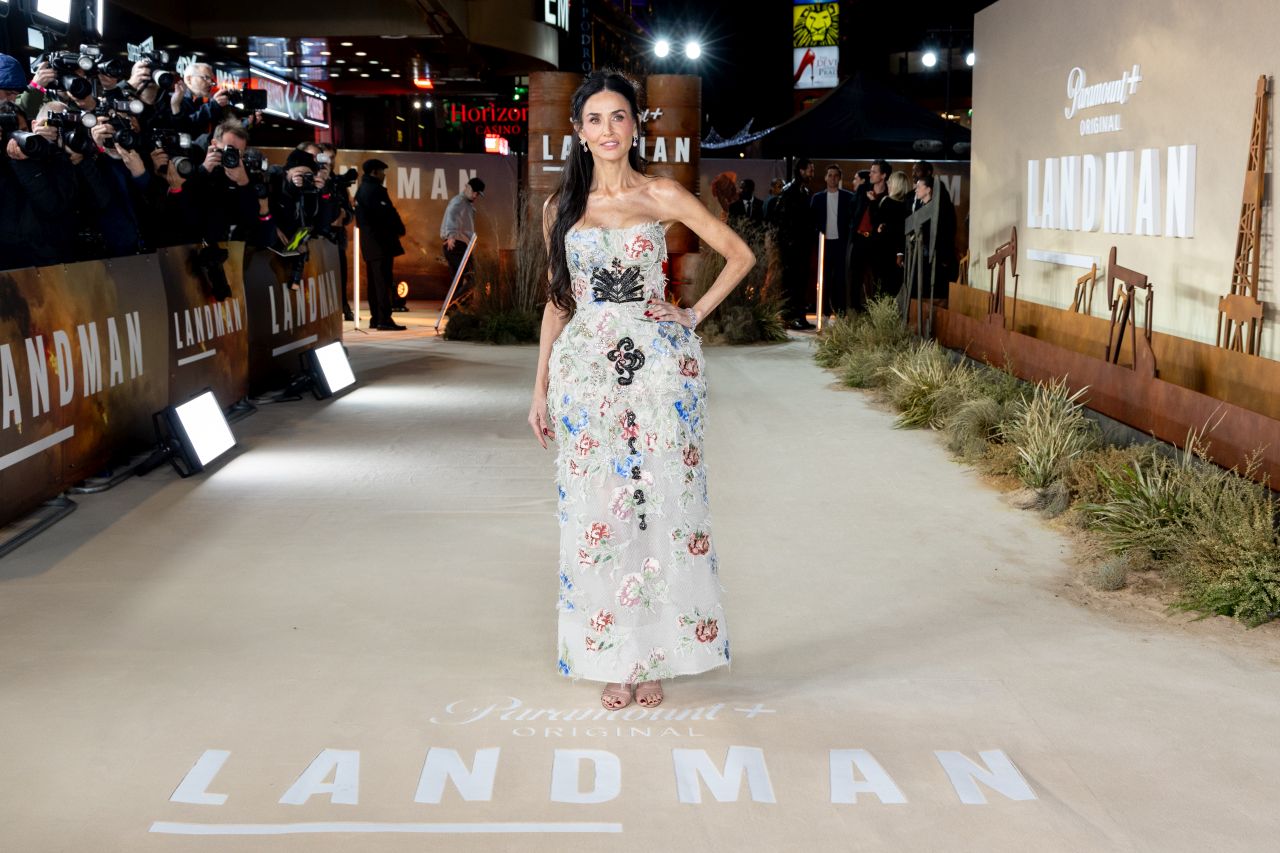 Д еми Мур отново доказа как да излъчва холивудски блясък на червения килим, като тази вечер открадна вниманието в зашеметяваща бродирана рокля на премиерата на втори сезон на сериала „Landman“. Американската актриса, на 63 години, се появи в прочутия Leicester Square в Лондон за прожекцията на западния драматичен сериал с рокля без презрамки до пода, богато украсена с черни, сини и червени цветя. Звездата, която играе Ками Милър в „Landman“, комбинира визията с обувки в телесен цвят и обици с лилави диаманти, а по-късно добави блейзър с цветна бродерия, за да се предпази от прохладното ноемврийско време. Роклята е от колекцията пролет/лято 2026 на луксозната модна къща Erdem, разкрива HELLO!.
