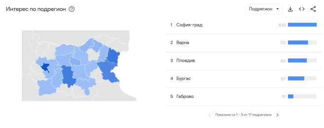 Що се отнася до България, търсенията от началото на месец ноември 2025 г. до края на януари 2026 г. са били най-много от хората, живеещи на територията на София-град, следван от Варна, Пловдив, Бургас и Габрово.
