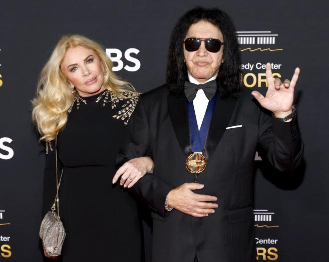Рок легендата Джийн Симънс избра пълно официално облекло с рокерски привкус – черен смокинг със сатенени ревери, тъмни очила и медала от Kennedy Center, гордо носен около врата. Съпругата му Шанън Тууд го допълни с елегантна черна рокля с дълги ръкави и впечатляващи златни детайли на раменете, добавяйки драма и скулптурен блясък. Златният ѝ клъч съчетаваше металическите елементи, а меките вълни и топъл грим завършиха изисканата визия.
