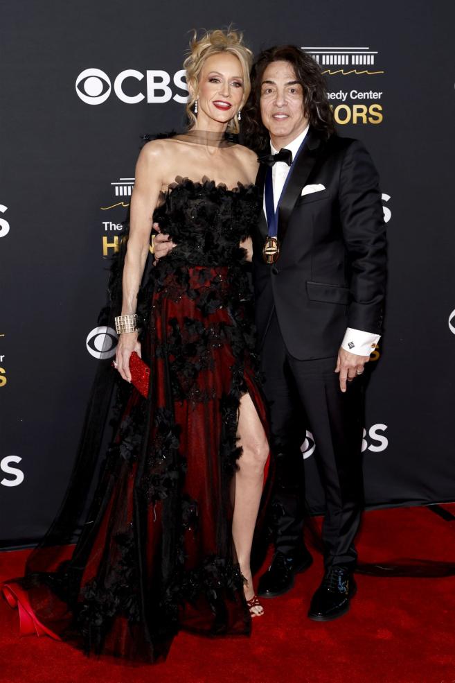 Фронтменът на KISS, Пол Стенли, заложи на класическа черна елегантност с добре скроен смокинг със сатенени ревери, бяла риза и папийонка, а медалът му от Kennedy Center добави формален нюанс. Съпругата му Ерин Сътън впечатли с драматична кутюр енергия в рокля без презрамки, съчетаваща черен тюл с дълбоки червени нюанси и обемни флорални апликации. Високата цепка добавяше движение, а гладката прическа, червеното червило и бляскавата маншетна гривна завършиха ансамбъла.