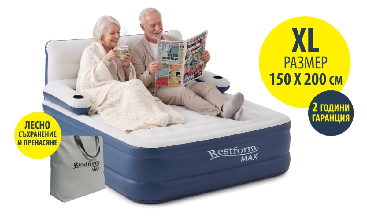 Restform Max съчетава удобството на стандартно легло с практичността на надуваемо. Подходящо е за дома, за къмпинг, за почивка и за всеки момент, когато ви трябва комфортно място за сън и отмора.