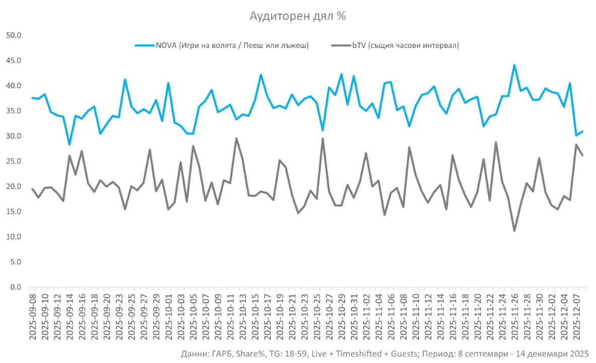 NOVA завърши есенния телевизионен сезон с голям преднина. След като преди седмица стана ясен тазгодишният победител в „Игри на волята”, снощи медията излъчи и последния епизод на „Пееш или лъжеш“.